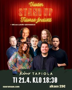 Liput: https://www.nauramaan.com/kino-tapiola-stand-up-vuoden-tulokas-finalistit-espoo-2026-04-21