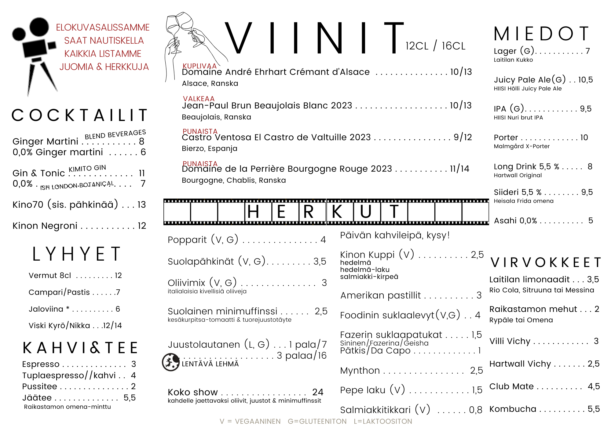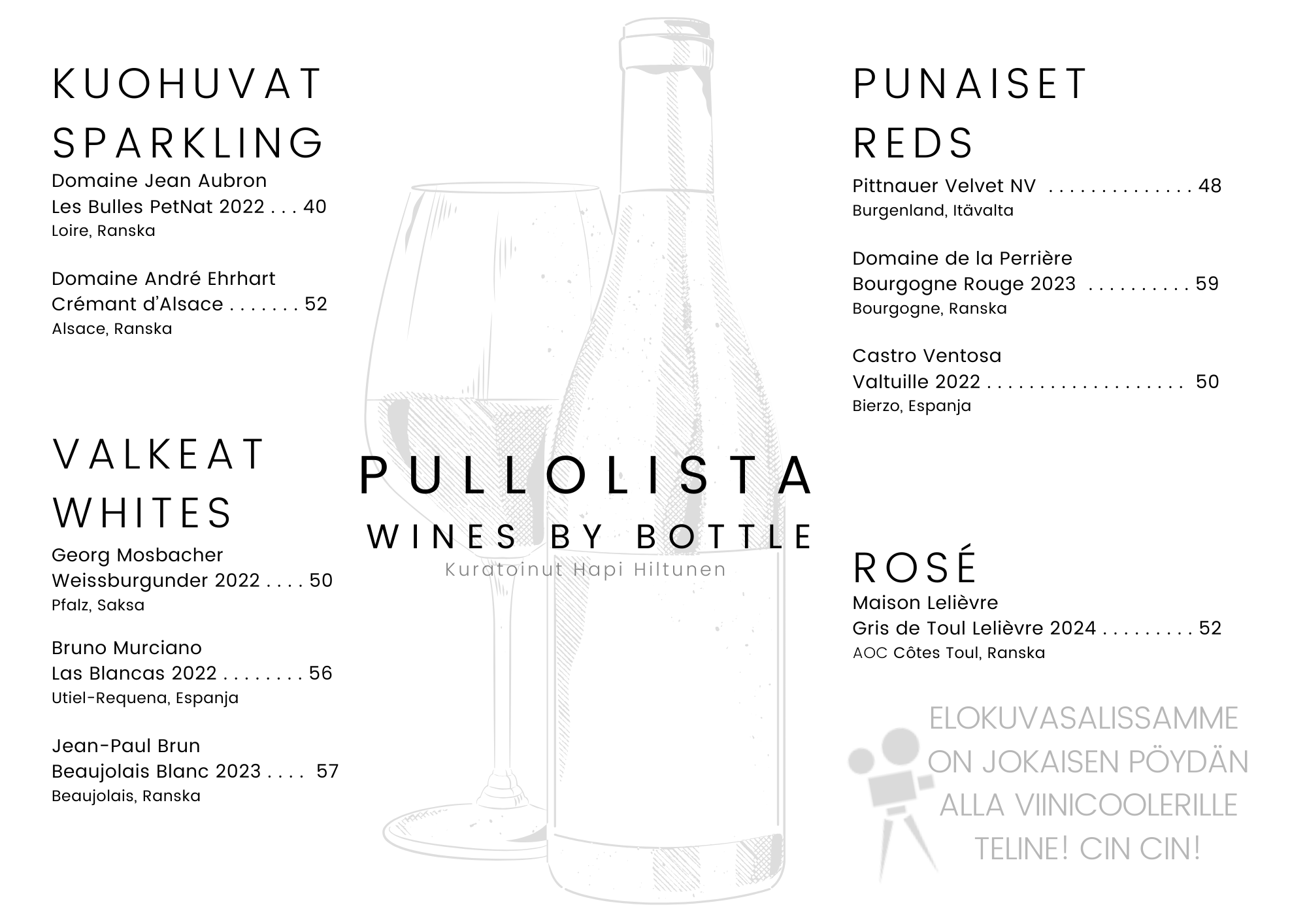 Laseihin kaadamme eurooppalaisten pientuottajien viinejä, jotka ilmentävät ravintolapäällikkömme ajatusta elokuvakulttuurin & viinikulttuurin kohtaamisesta. Kiehtova elokuva & viini herättävät keskustelua, kertoen tarinaa niin menneestä kuin tulevastakin.